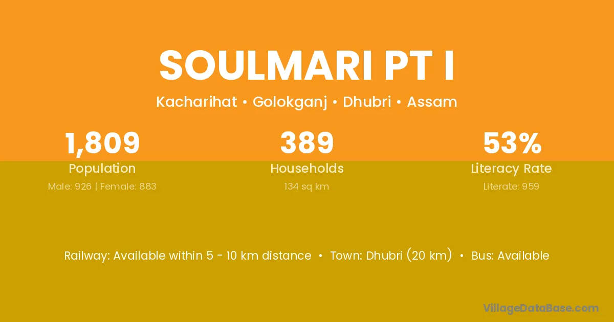 Dhubri (20 km) is the nearest town to Soulmari Pt I village for major economic activities and is located approximately 20 km away.