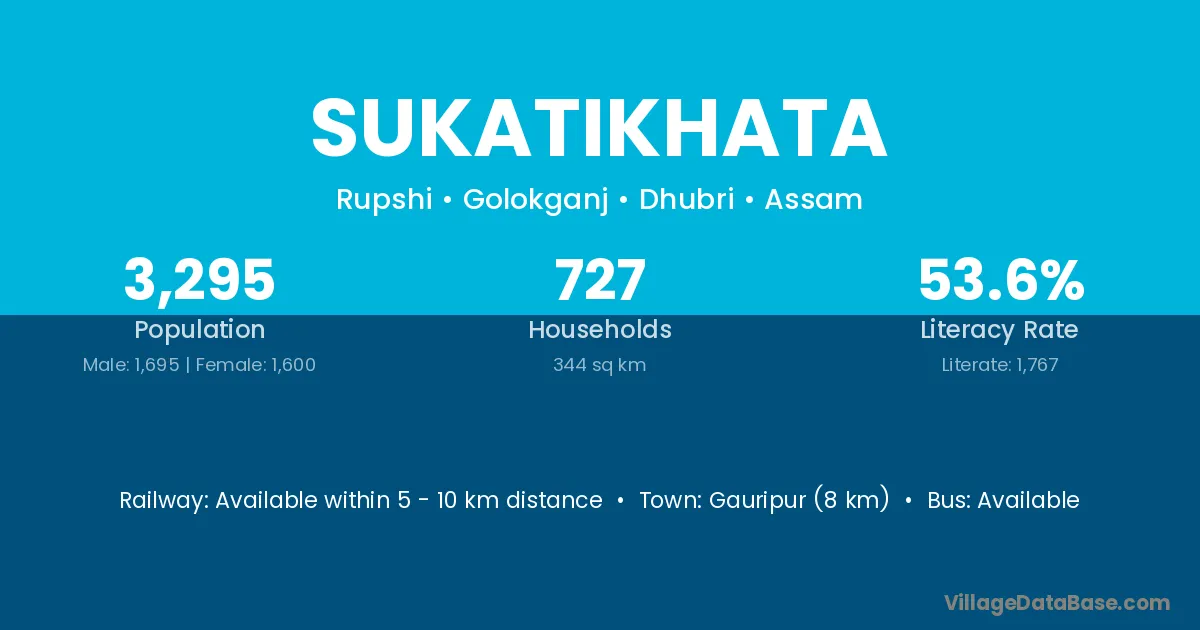 Gauripur (8 km) is the nearest town to Sukatikhata village for major economic activities and is located approximately 8 km away.