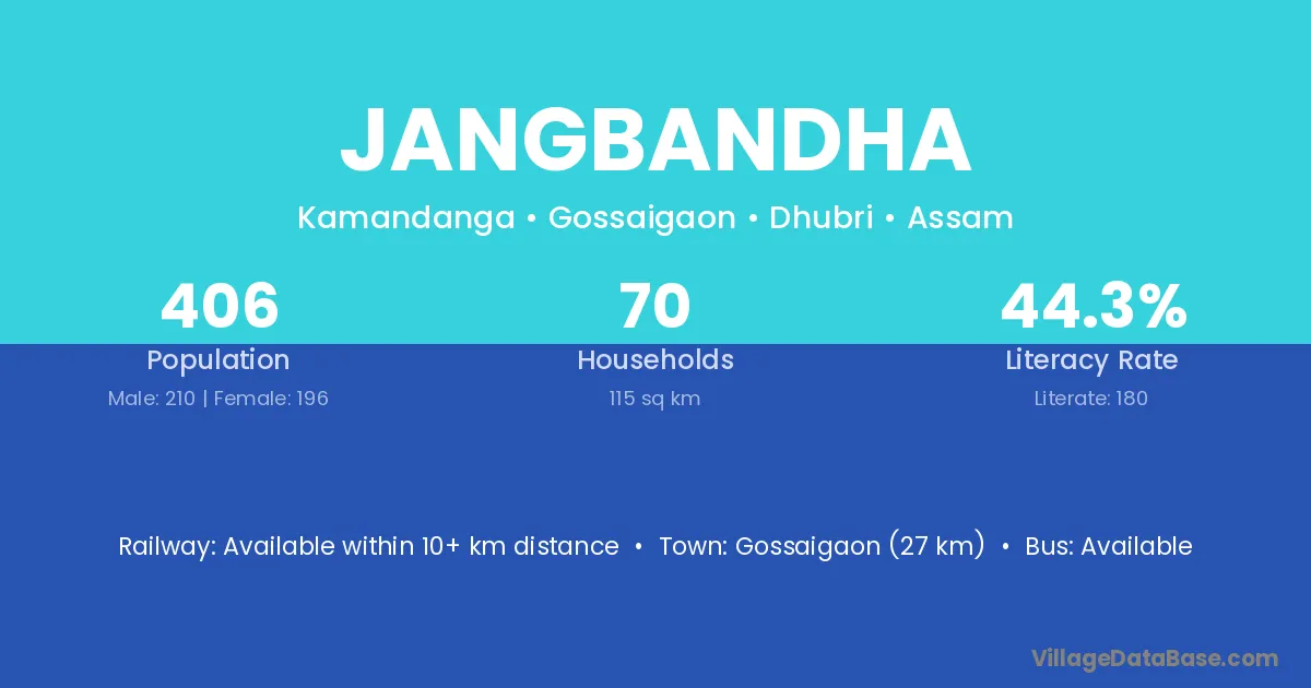 Gossaigaon (27 km) is the nearest town to Jangbandha village for major economic activities and is located approximately 27 km away.
