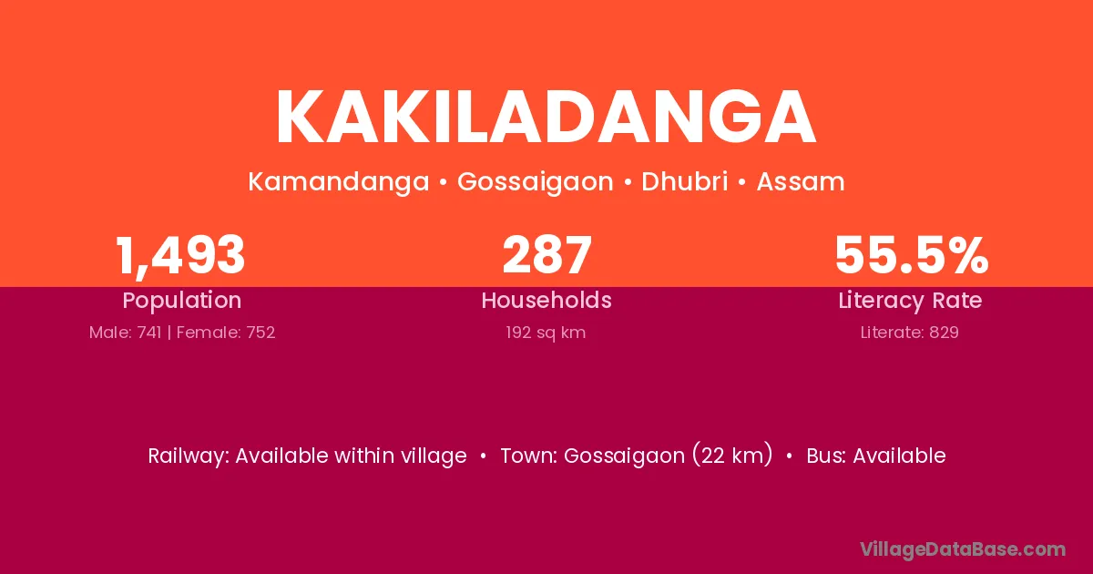 Gossaigaon (22 km) is the nearest town to Kakiladanga village for major economic activities and is located approximately 22 km away.