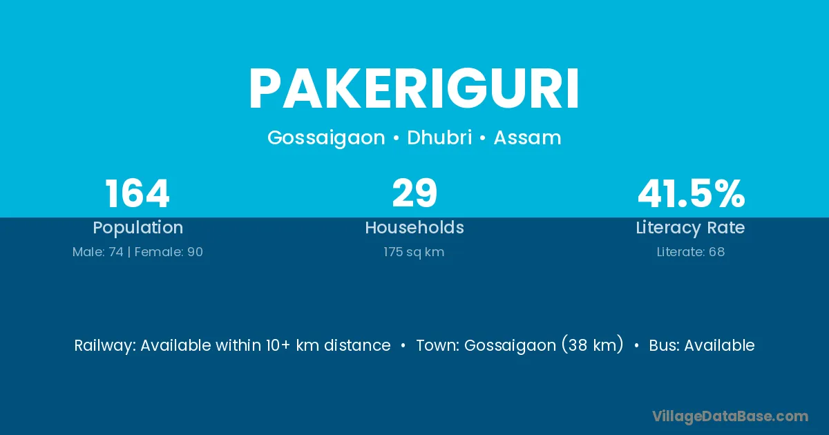 Gossaigaon (38 km) is the nearest town to Pakeriguri village for major economic activities and is located approximately 38 km away.