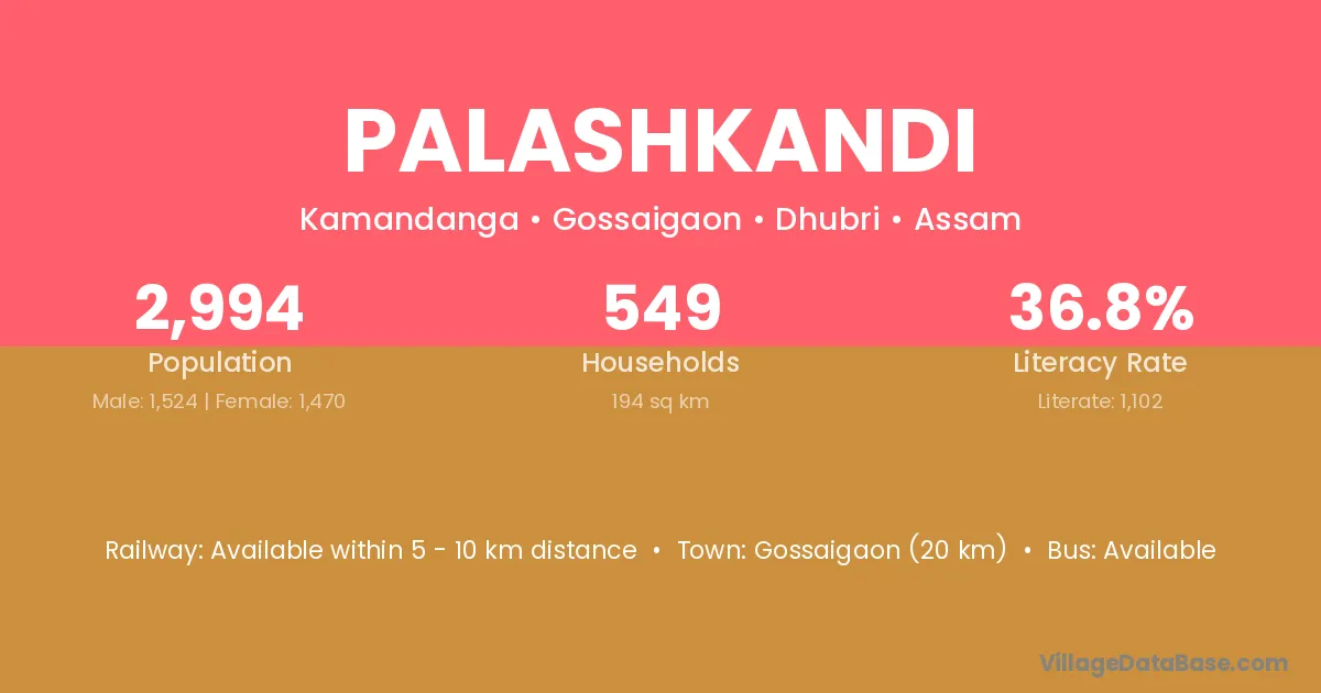 Gossaigaon (20 km) is the nearest town to Palashkandi village for major economic activities and is located approximately 20 km away.