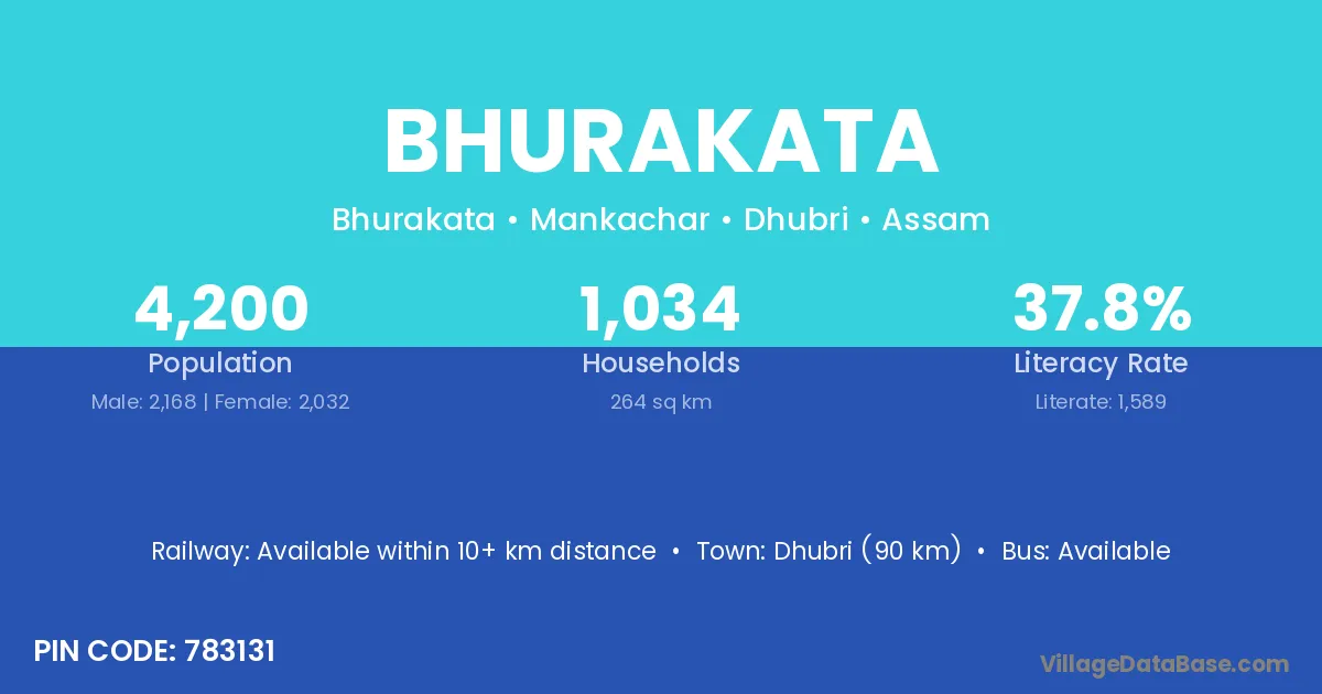 Dhubri (90 km) is the nearest town to Bhurakata village for major economic activities and is located approximately 90 km away.