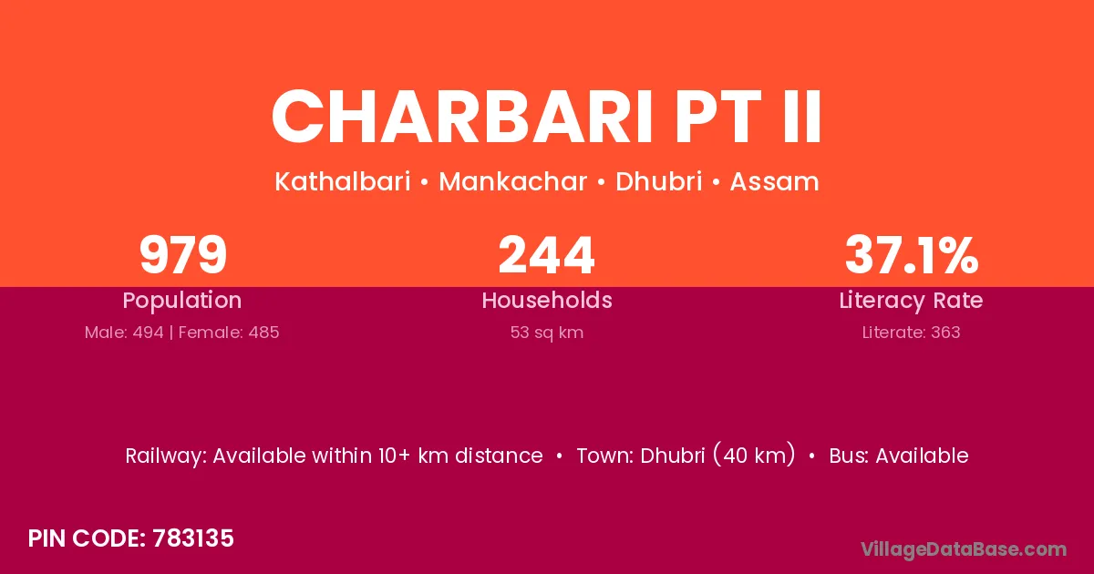 Dhubri (40 km) is the nearest town to Charbari Pt Ii village for major economic activities and is located approximately 40 km away.