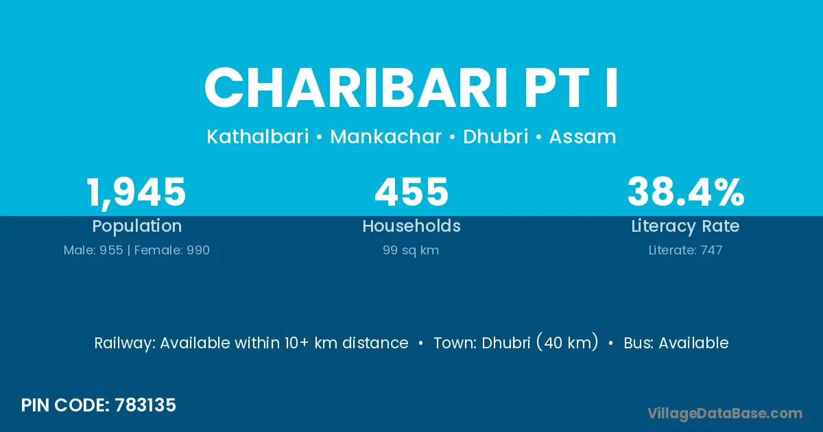 Dhubri (40 km) is the nearest town to Charibari Pt I village for major economic activities and is located approximately 40 km away.
