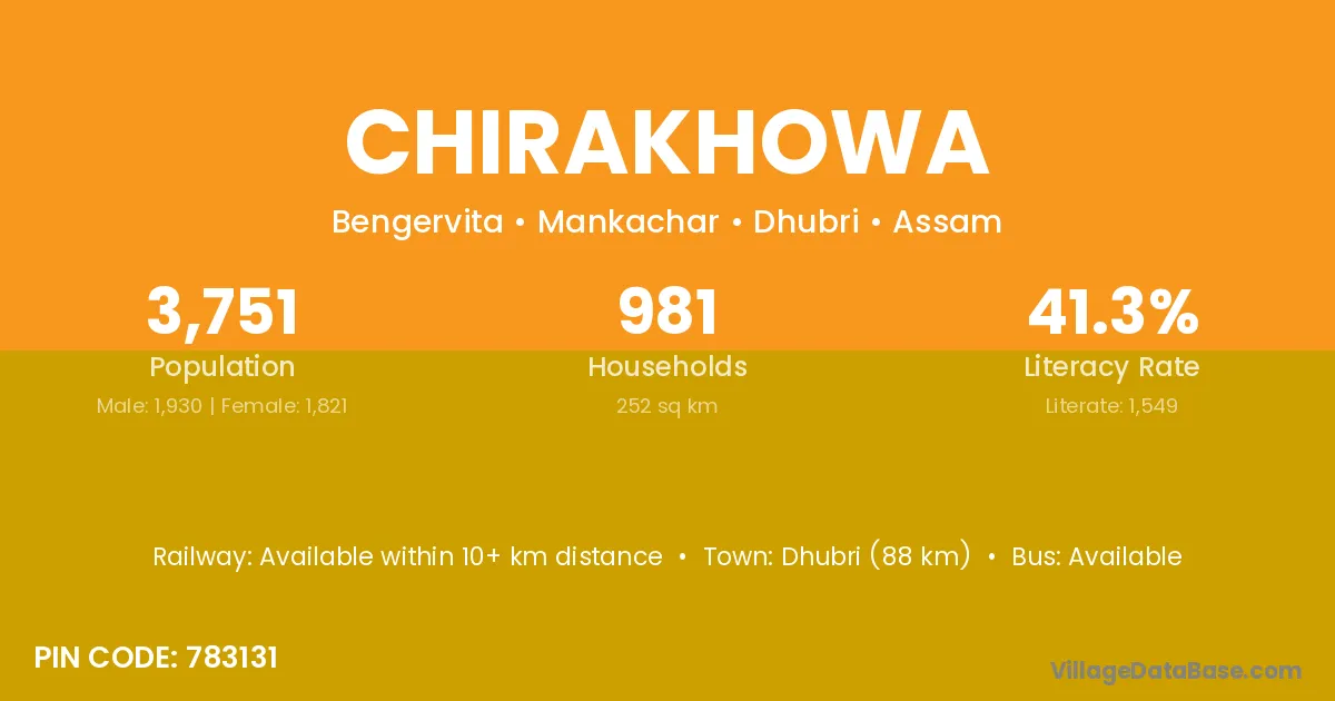 Dhubri (88 km) is the nearest town to Chirakhowa village for major economic activities and is located approximately 88 km away.