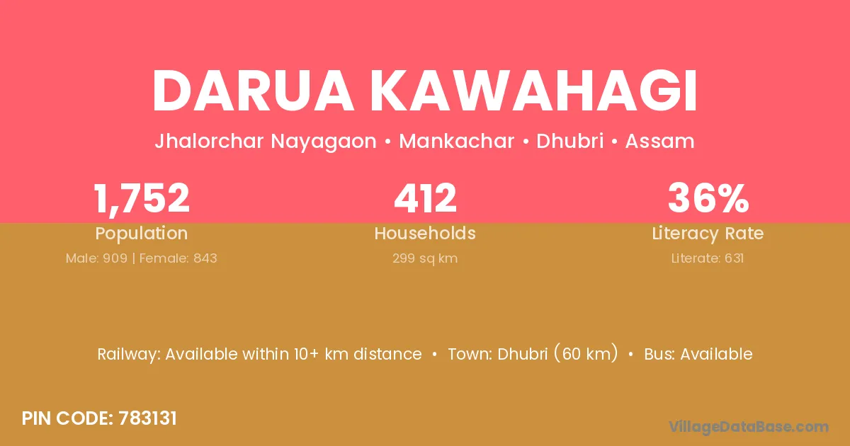 Dhubri (60 km) is the nearest town to Darua Kawahagi village for major economic activities and is located approximately 60 km away.