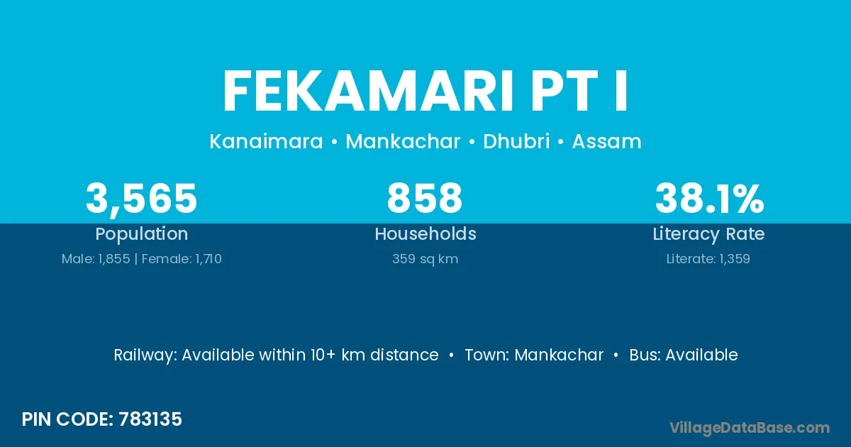 Fekamari Pt I village has a total population of 3,565 people, of which 1,855 are males and 1,710 are females.