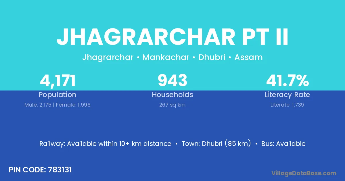 Dhubri (85 km) is the nearest town to Jhagrarchar Pt Ii village for major economic activities and is located approximately 85 km away.