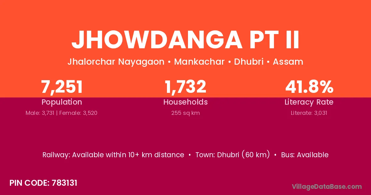Dhubri (60 km) is the nearest town to Jhowdanga Pt Ii village for major economic activities and is located approximately 60 km away.
