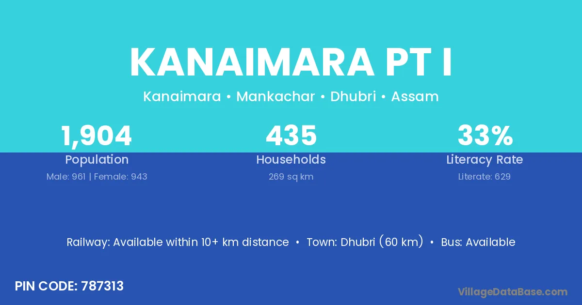 Dhubri (60 km) is the nearest town to Kanaimara Pt I village for major economic activities and is located approximately 60 km away.