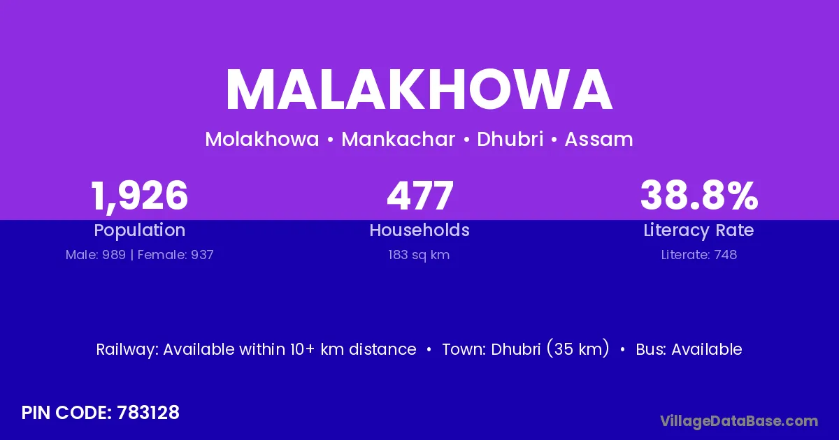 Dhubri (35 km) is the nearest town to Malakhowa village for major economic activities and is located approximately 35 km away.