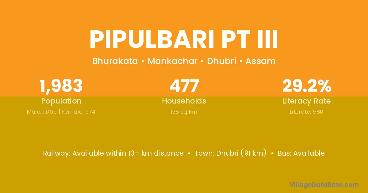 Dhubri (91 km) is the nearest town to Pipulbari Pt Iii village for major economic activities and is located approximately 91 km away.
