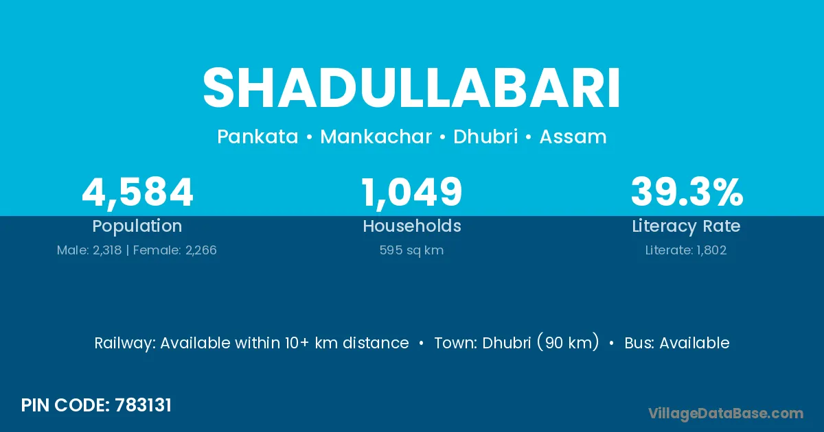 Dhubri (90 km) is the nearest town to Shadullabari village for major economic activities and is located approximately 90 km away.