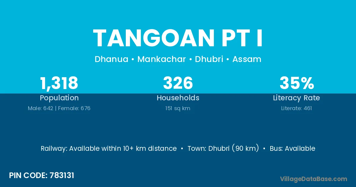 Dhubri (90 km) is the nearest town to Tangoan Pt I village for major economic activities and is located approximately 90 km away.