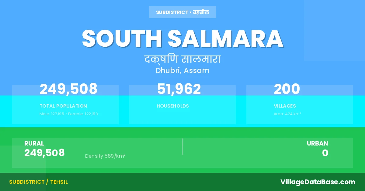 According to the 2011 census The total area of South Salmara Subdivision is 424 km², with a population of 249508 people. The population density is 589 inhabitants per square kilometre, and there are approximately 51962 houses in the sub district.