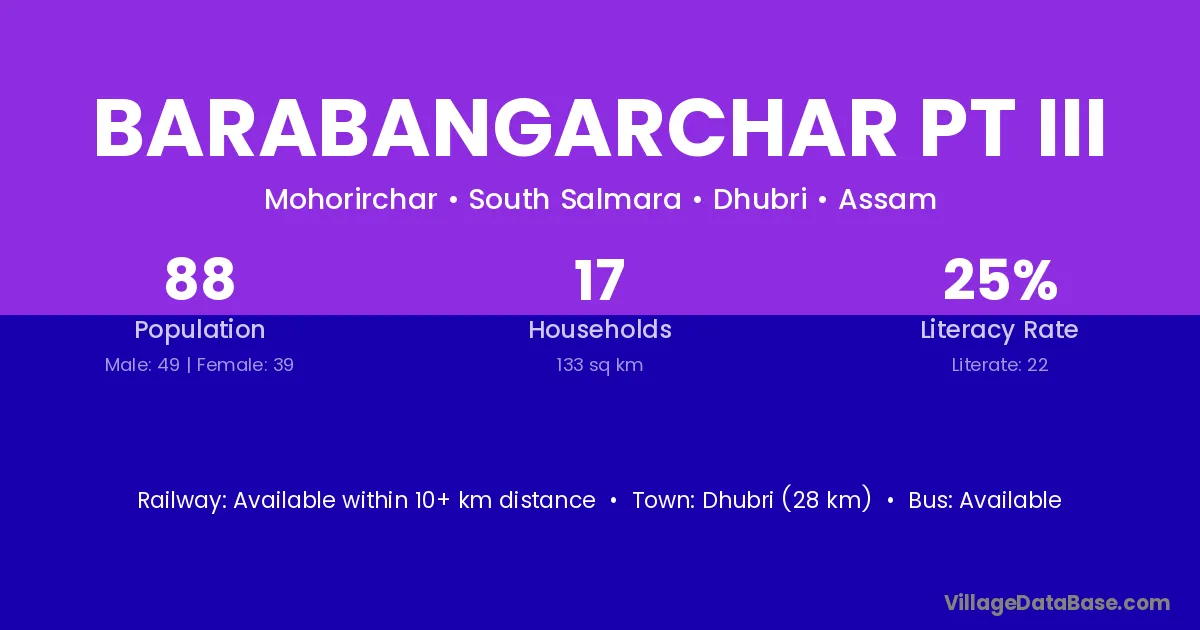 Dhubri (28 km) is the nearest town to Barabangarchar Pt Iii village for major economic activities and is located approximately 28 km away.