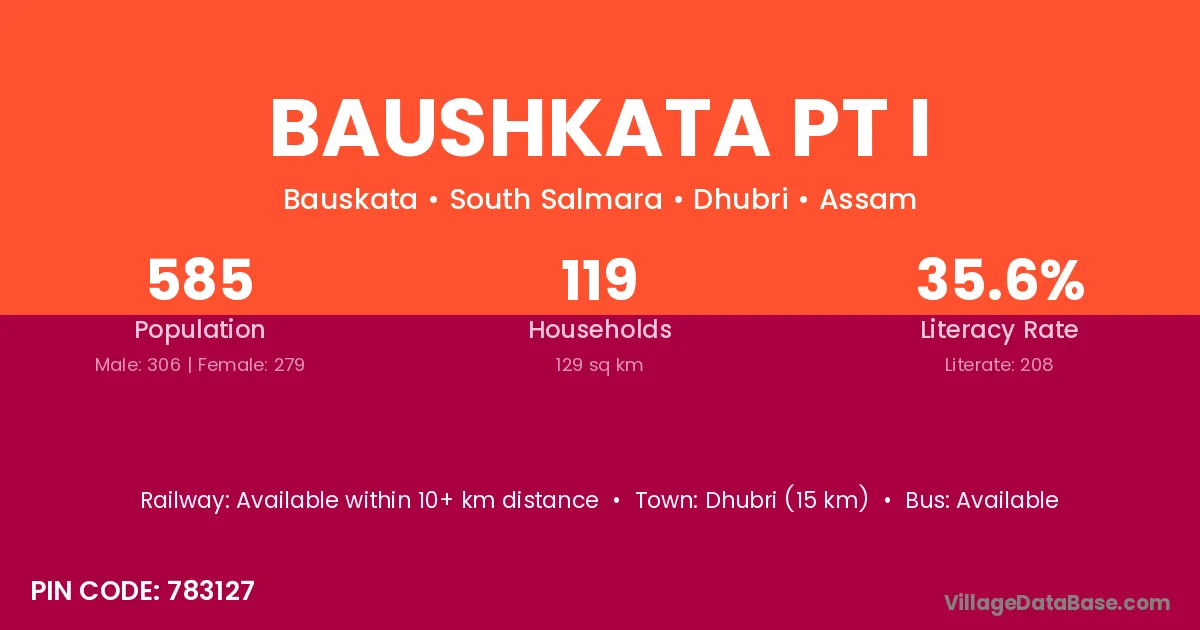 Dhubri (15 km) is the nearest town to Baushkata Pt I village for major economic activities and is located approximately 15 km away.