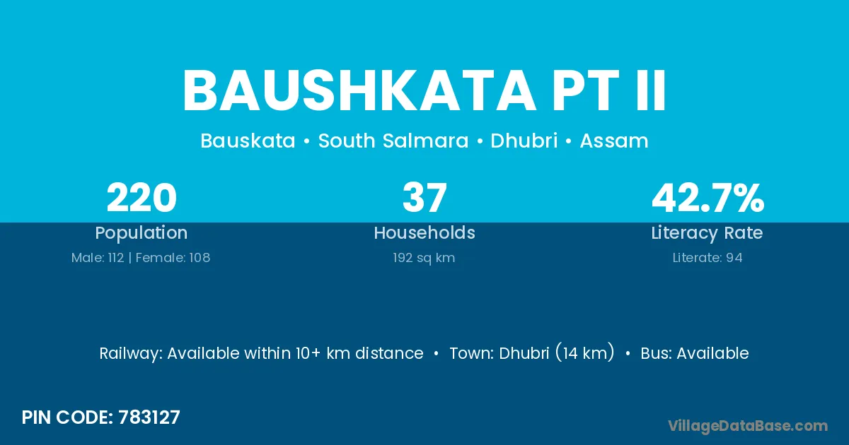 Dhubri (14 km) is the nearest town to Baushkata Pt Ii village for major economic activities and is located approximately 14 km away.