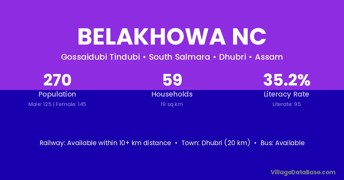 Dhubri (20 km) is the nearest town to Belakhowa Nc village for major economic activities and is located approximately 20 km away.