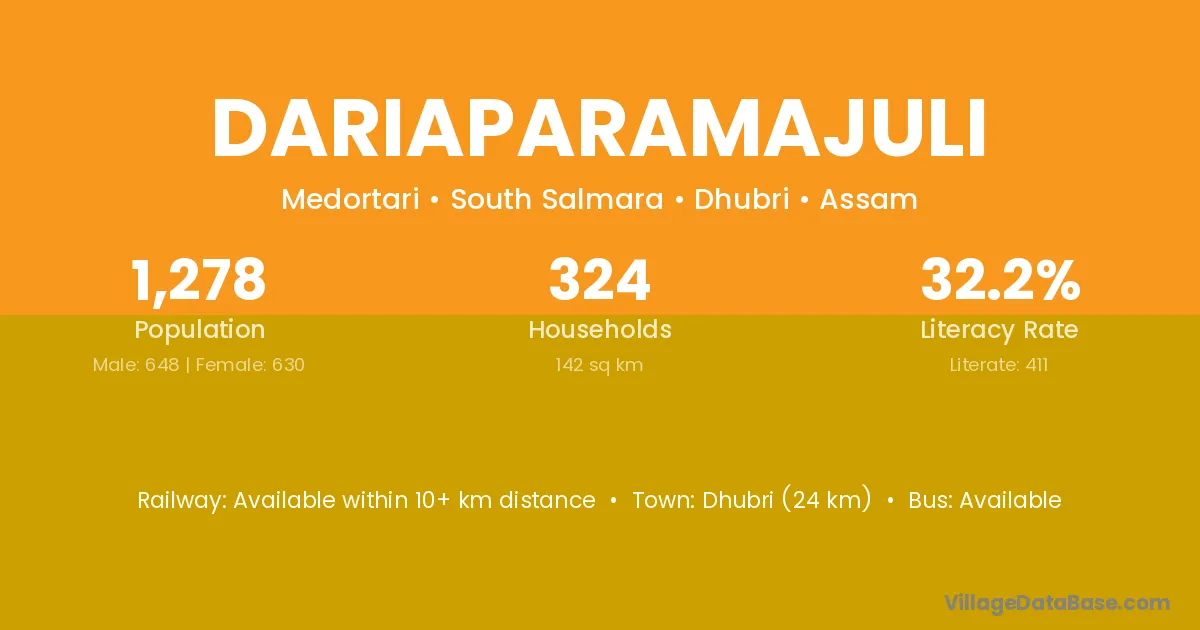 Dhubri (24 km) is the nearest town to Dariaparamajuli village for major economic activities and is located approximately 24 km away.