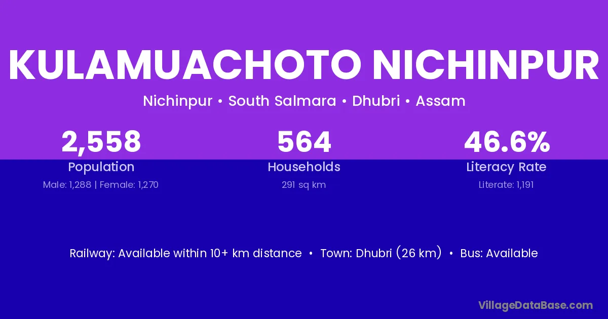Dhubri (26 km) is the nearest town to Kulamuachoto Nichinpur village for major economic activities and is located approximately 26 km away.