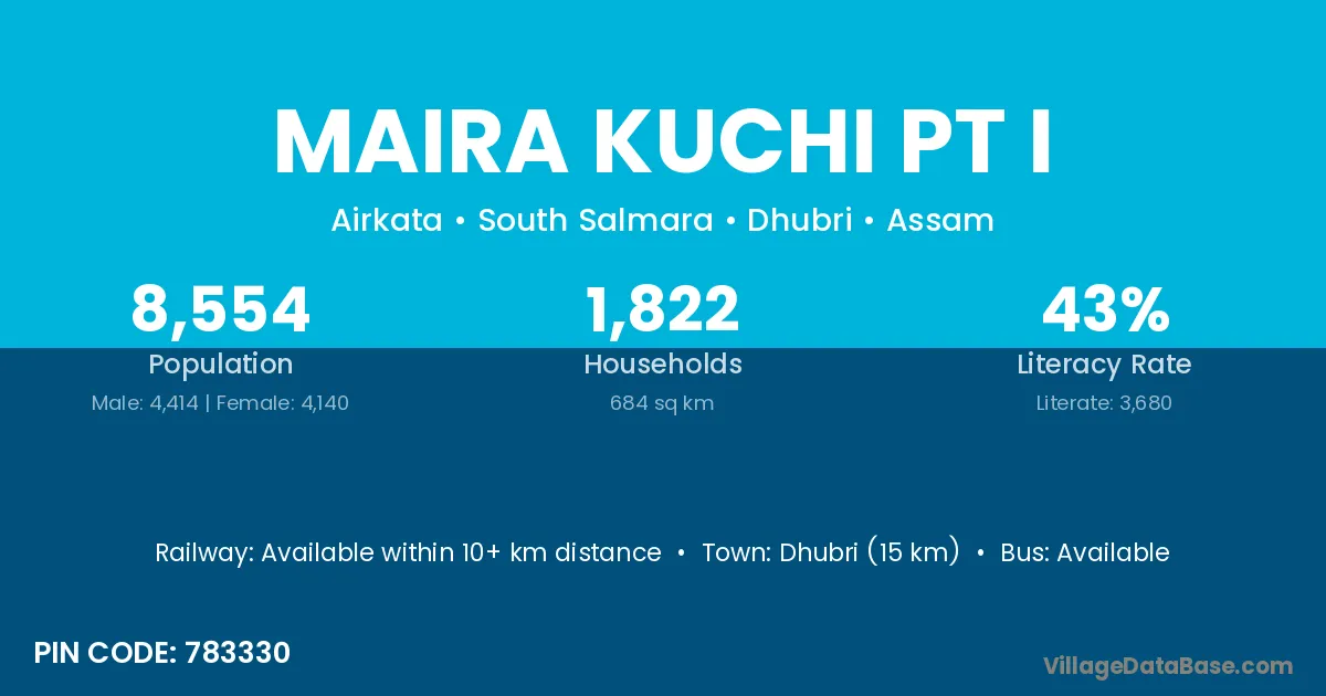 Dhubri (15 km) is the nearest town to Maira Kuchi Pt I village for major economic activities and is located approximately 15 km away.