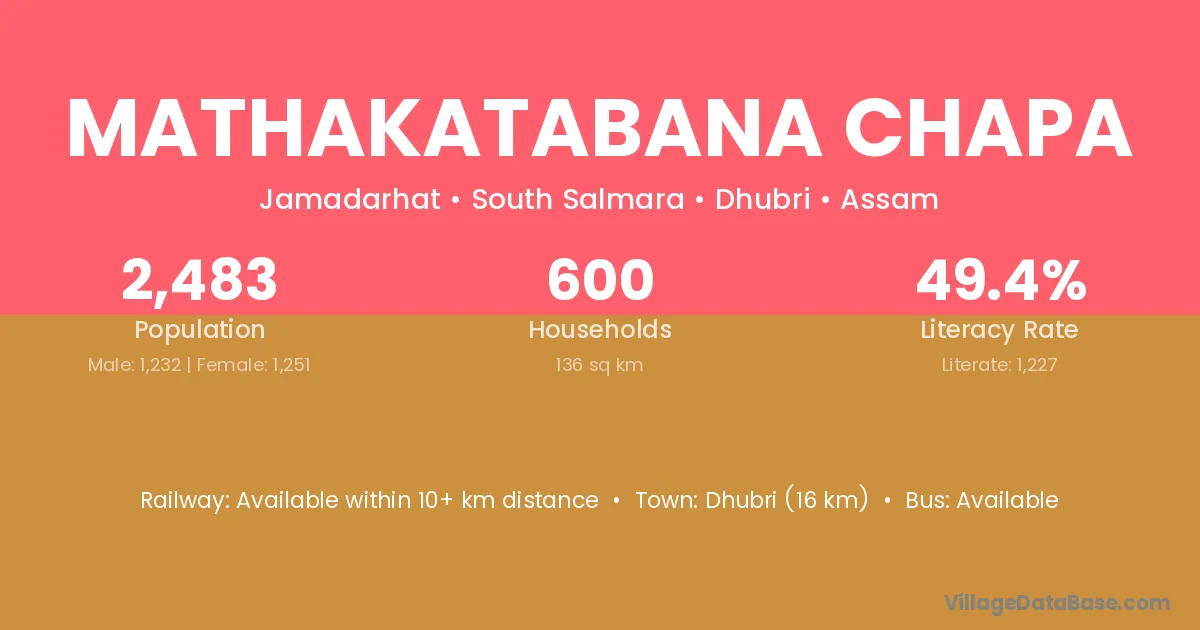Dhubri (16 km) is the nearest town to Mathakatabana Chapa village for major economic activities and is located approximately 16 km away.