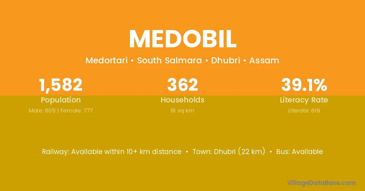 Dhubri (22 km) is the nearest town to Medobil village for major economic activities and is located approximately 22 km away.