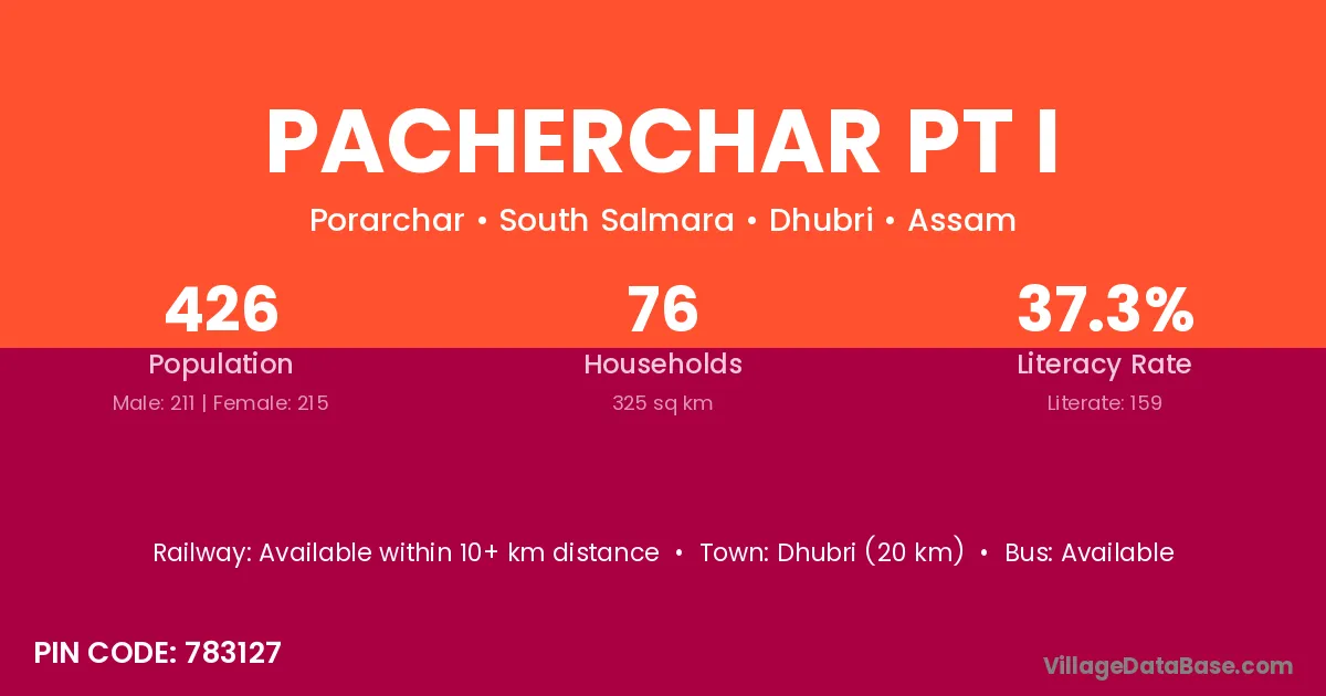 Dhubri (20 km) is the nearest town to Pacherchar Pt I village for major economic activities and is located approximately 20 km away.