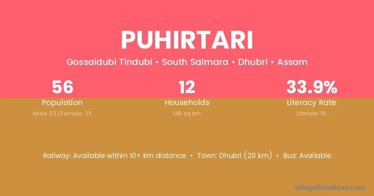 Dhubri (20 km) is the nearest town to Puhirtari village for major economic activities and is located approximately 20 km away.