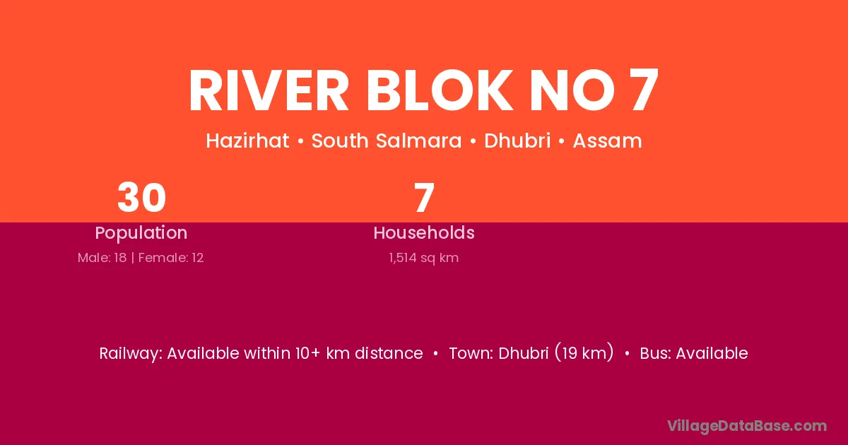Dhubri (19 km) is the nearest town to River Blok No 7 village for major economic activities and is located approximately 19 km away.