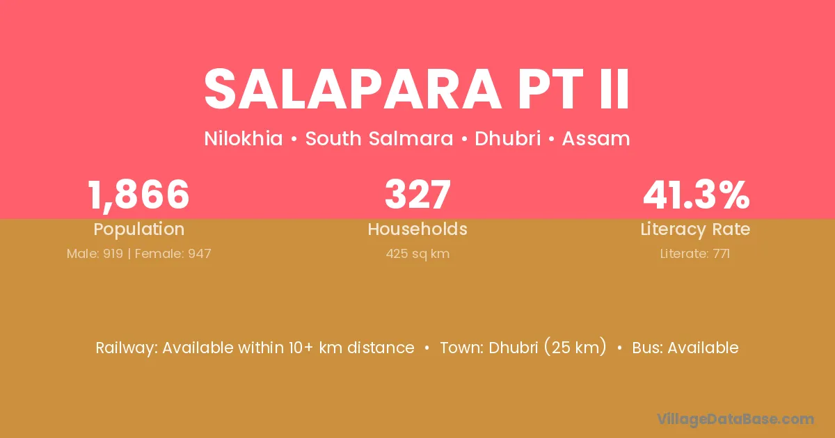 Dhubri (25 km) is the nearest town to Salapara Pt Ii village for major economic activities and is located approximately 25 km away.