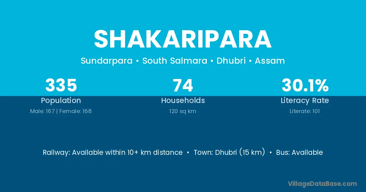 Dhubri (15 km) is the nearest town to Shakaripara village for major economic activities and is located approximately 15 km away.