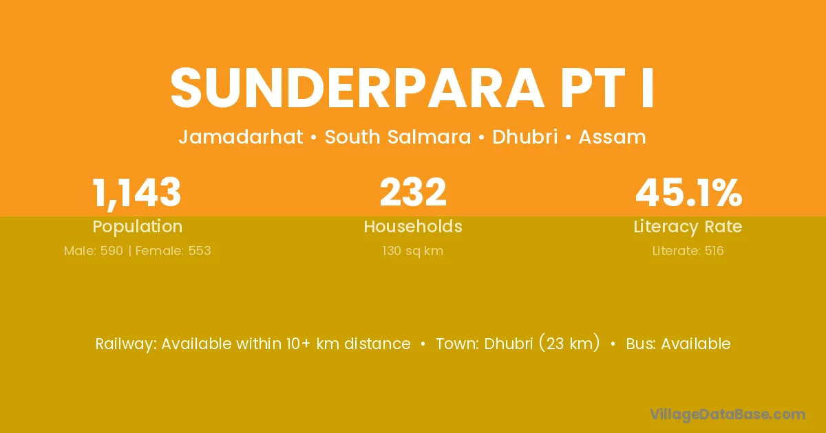 Dhubri (23 km) is the nearest town to Sunderpara Pt I village for major economic activities and is located approximately 23 km away.