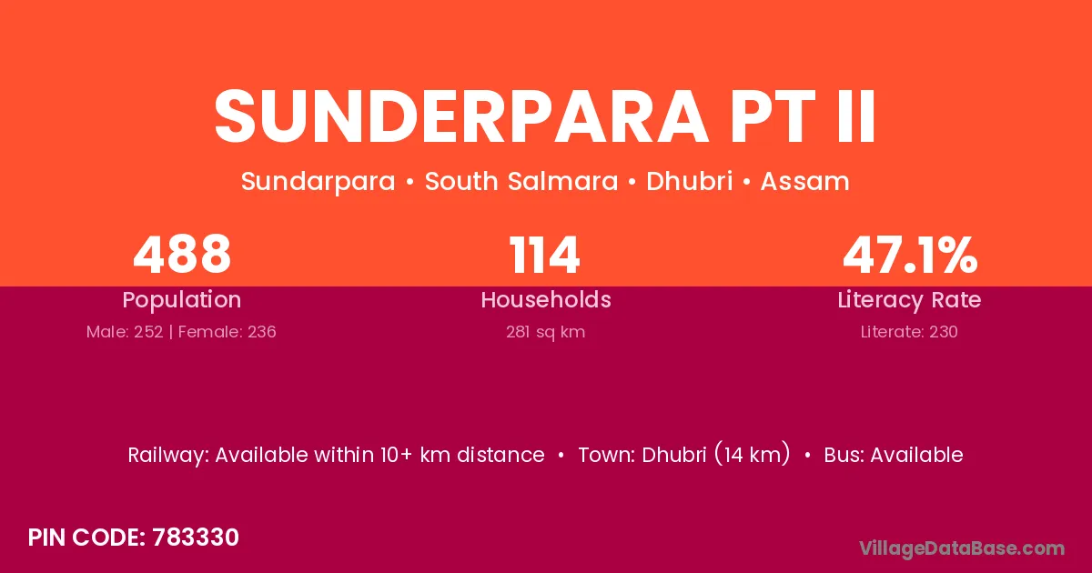 Dhubri (14 km) is the nearest town to Sunderpara Pt Ii village for major economic activities and is located approximately 14 km away.