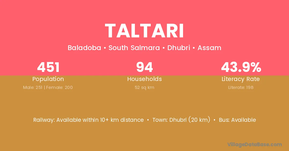 Dhubri (20 km) is the nearest town to Taltari village for major economic activities and is located approximately 20 km away.