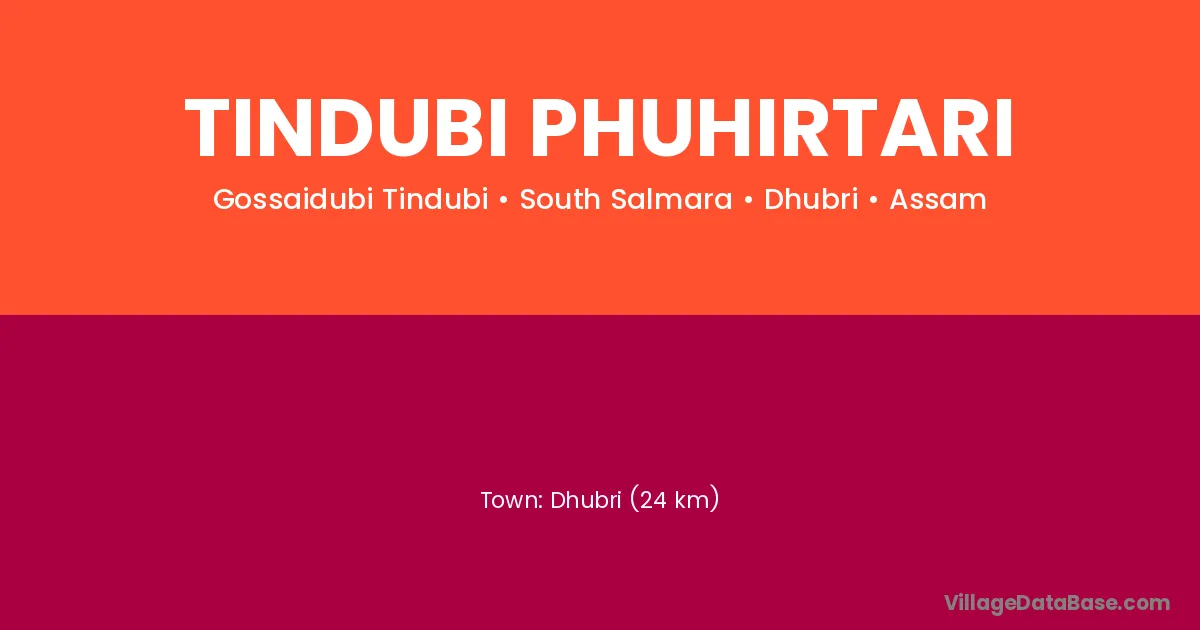 Dhubri (24 km) is the nearest town to Tindubi Phuhirtari village for major economic activities and is located approximately 24 km away.