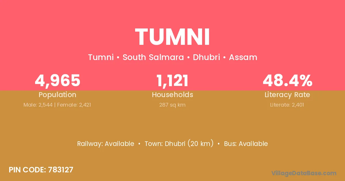 Dhubri (20 km) is the nearest town to Tumni village for major economic activities and is located approximately 20 km away.