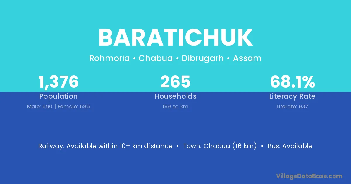 Chabua (16 km) is the nearest town to Baratichuk village for major economic activities and is located approximately 16 km away.