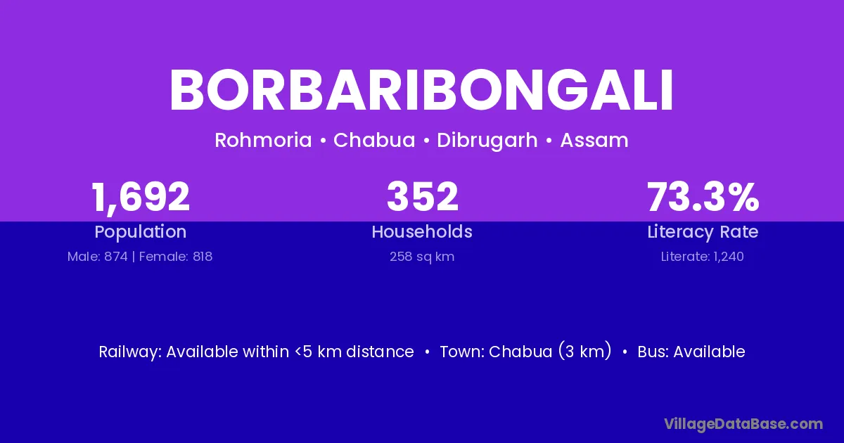 Chabua (3 km) is the nearest town to Borbaribongali village for major economic activities and is located approximately 3 km away.