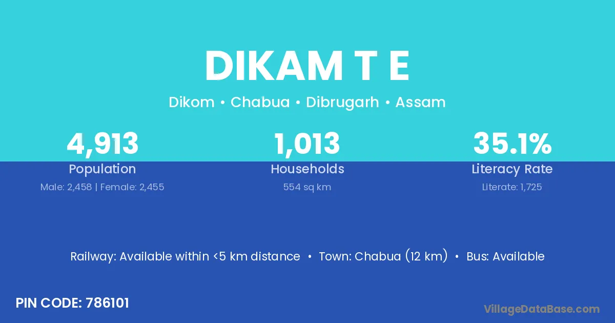 Chabua (12 km) is the nearest town to Dikam T E village for major economic activities and is located approximately 12 km away.