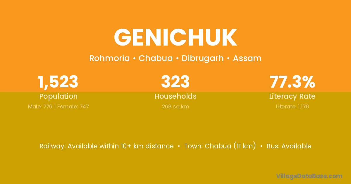 Chabua (11 km) is the nearest town to Genichuk village for major economic activities and is located approximately 11 km away.