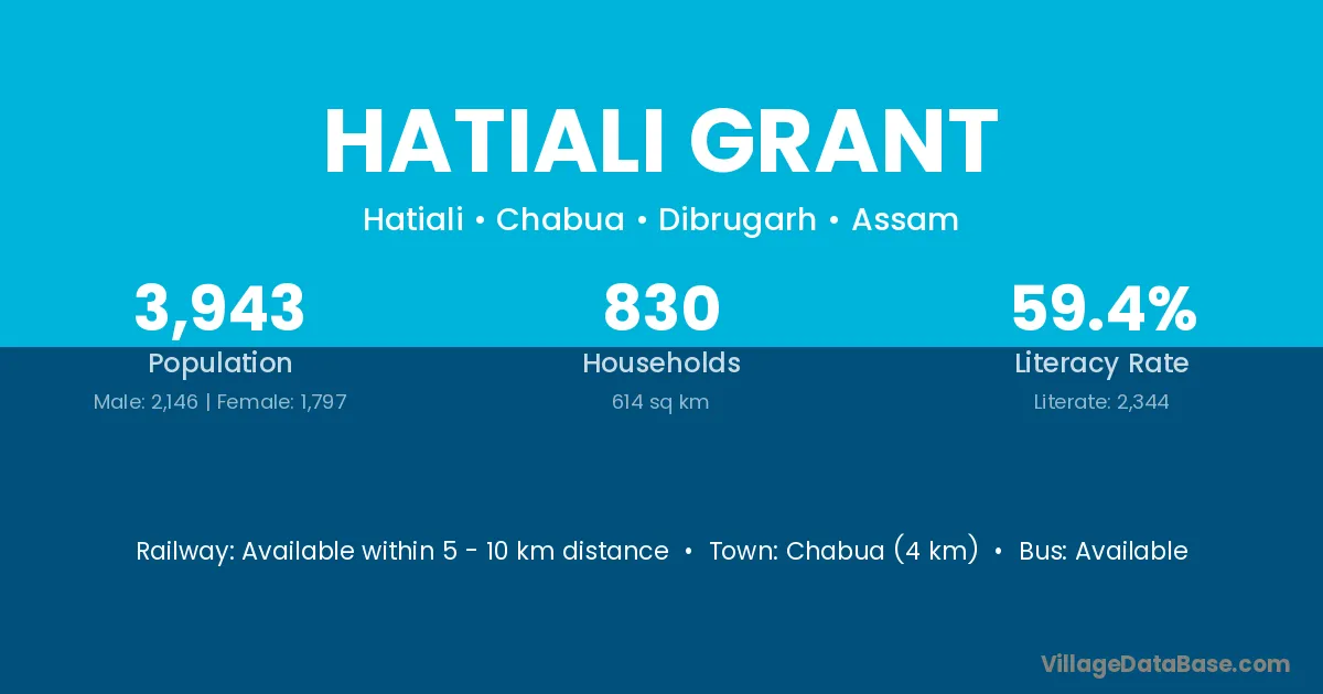 Chabua (4 km) is the nearest town to Hatiali Grant village for major economic activities and is located approximately 4 km away.