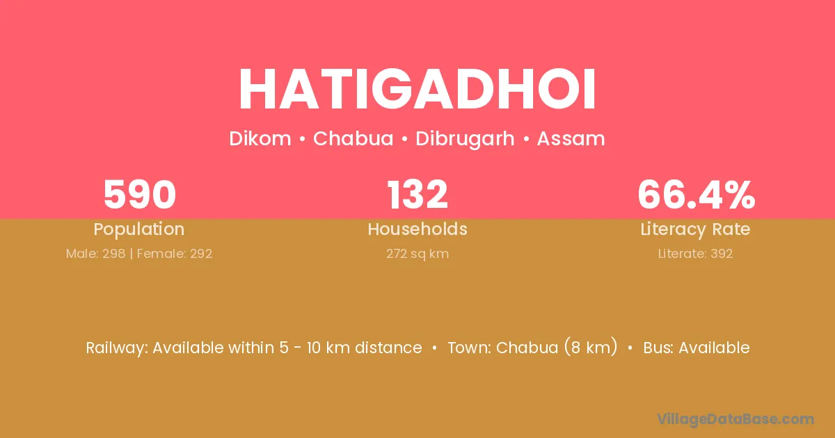Chabua (8 km) is the nearest town to Hatigadhoi village for major economic activities and is located approximately 8 km away.