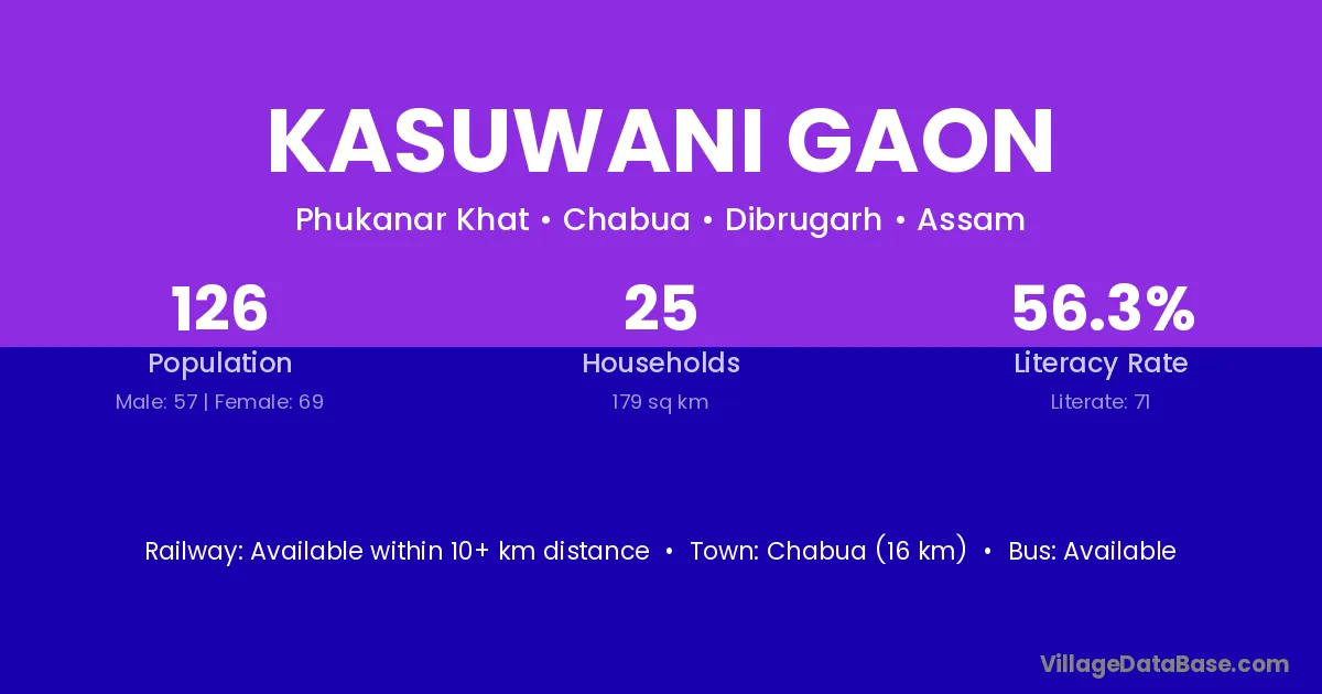 Chabua (16 km) is the nearest town to Kasuwani Gaon village for major economic activities and is located approximately 16 km away.