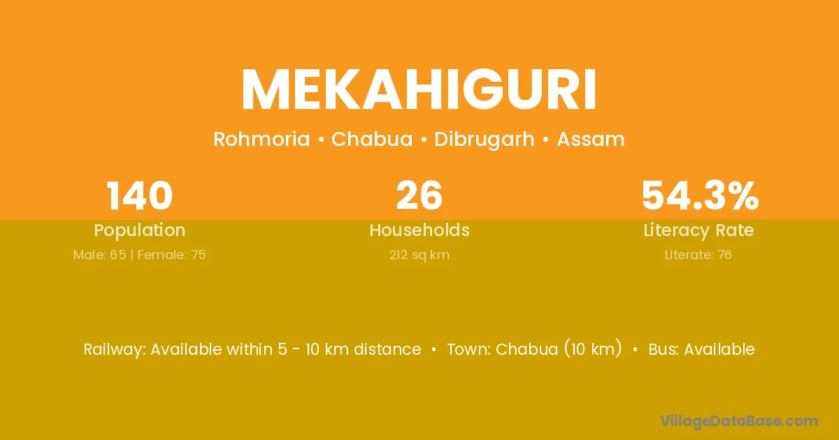 Chabua (10 km) is the nearest town to Mekahiguri village for major economic activities and is located approximately 10 km away.
