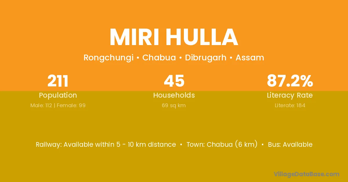 Chabua (6 km) is the nearest town to Miri Hulla village for major economic activities and is located approximately 6 km away.