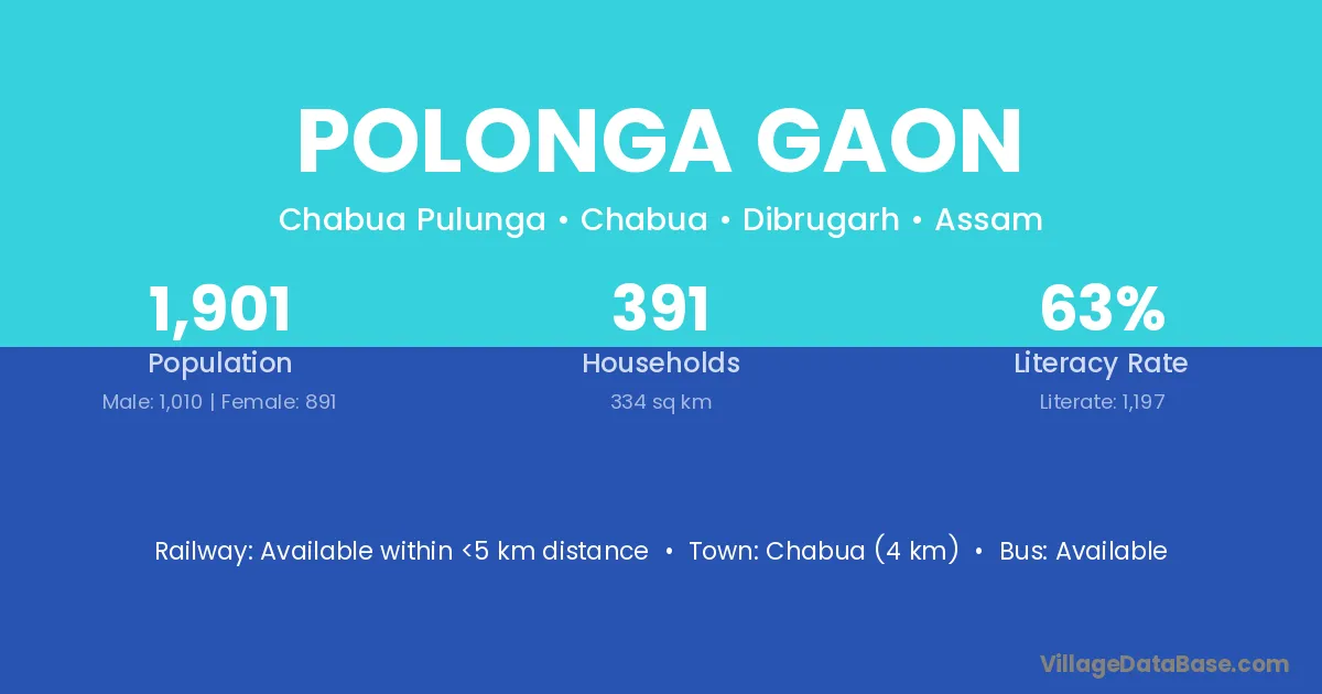 Chabua (4 km) is the nearest town to Polonga Gaon village for major economic activities and is located approximately 4 km away.
