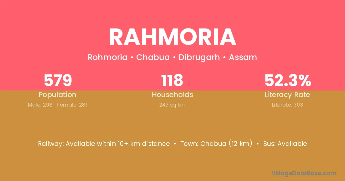 Chabua (12 km) is the nearest town to Rahmoria village for major economic activities and is located approximately 12 km away.